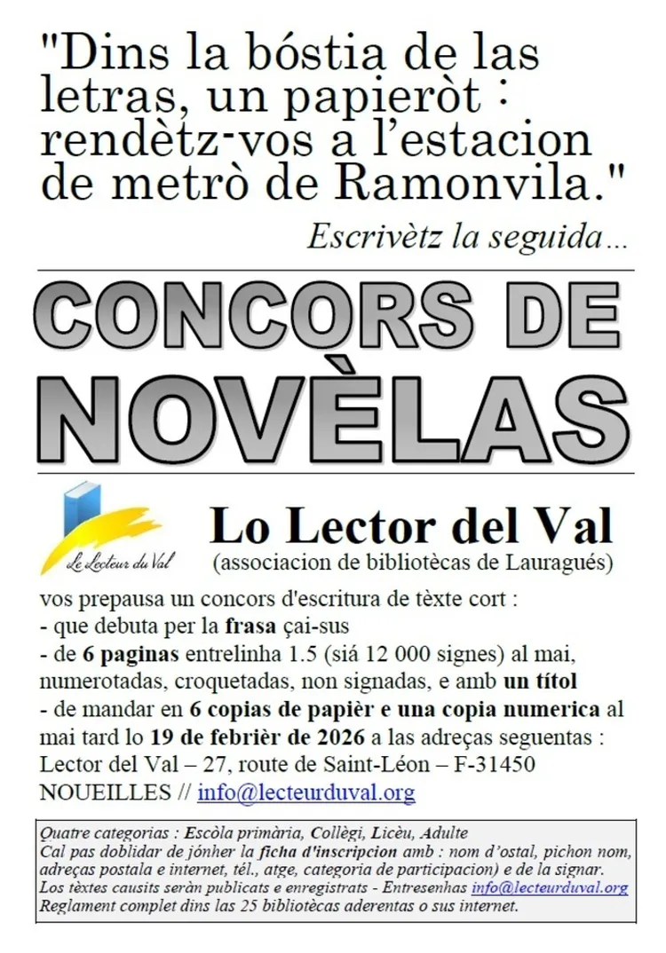🖊️ Coma cada an, lo Lector del Val organiza un concors d'escritura en occitan (e en francés), dobèrt a totas e totes, e que comença per la frasa impausada : "Dins la bóstia de las letras, un papieròt : rendètz-vos a l’estacion de metrò de Ramonvila." Escrivètz la seguida !