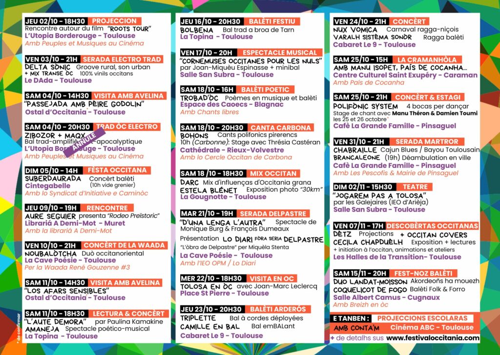 Coma cada an, la davalada se’n torna e amb ela… lo Festival Occitania ! Per aquela edicion, vos balham rdv per 24 eveniments per descobrir las creacions occitanas actualas, e vos podèm ja assegurar que cadun·a i traparà son compte ! Al programa : musica, dança, literatura, cinema, teatre, visitas ; entre Tolosa, Murèth, Blanhac, Rius Volvèstre, Cunhaus, Pinsaguel o encara Caraman, la còla de l’IEO 31 e sos partenaris vos esperan per festejar la lenga e la cultura occitanas !
