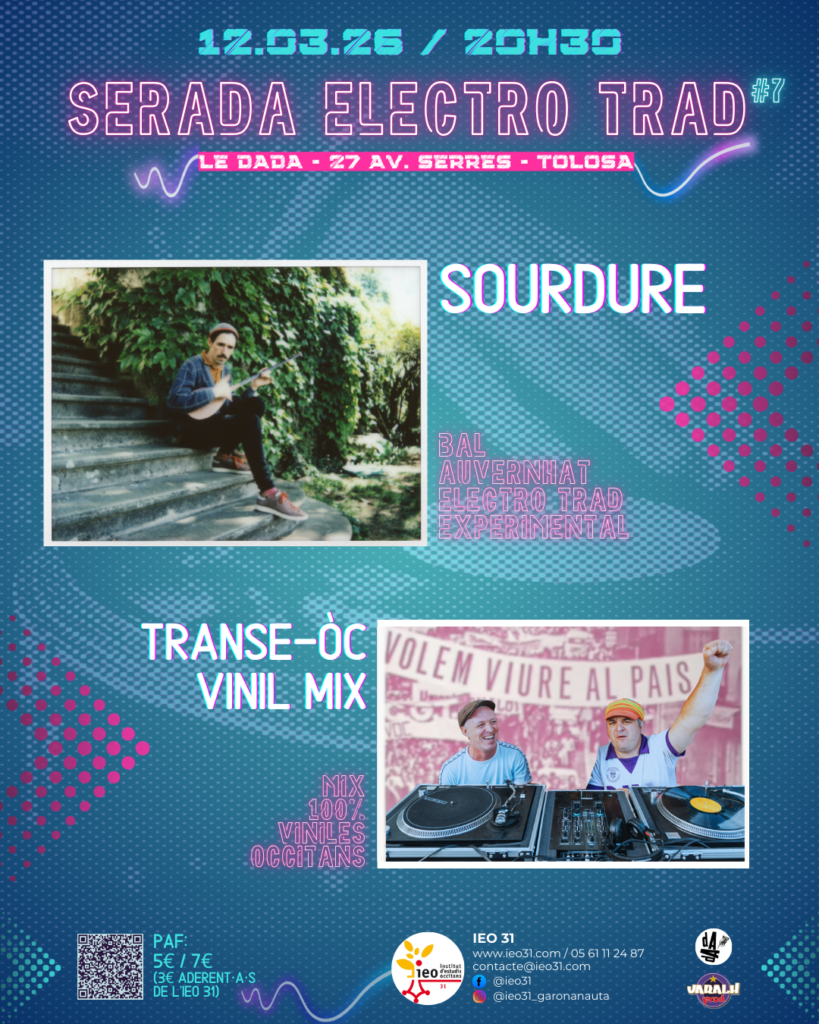🌟 Un còp de mai, on se retrouve à l’incontournable soirée électrotrad au Dada à Tolosa le jeudi 12 mars dès 20h30 ! Au programme de cette soirée, nous accueilleron sourdure ! Et comme d’hab, le transe-òc vinil mix de Mr Brun & La Mascanha, mix 100% vinyles occitans !